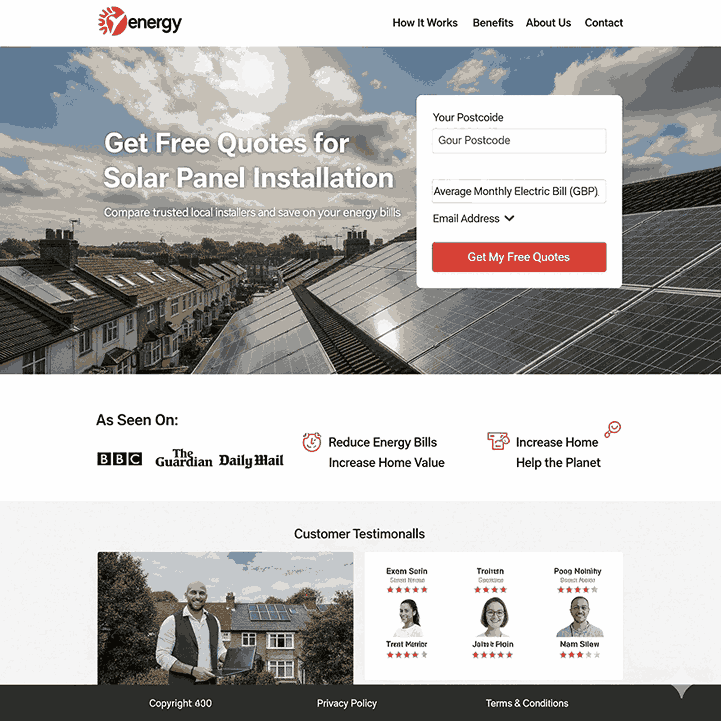 Designed a conversion-focused website for a UK-based solar installer, increasing lead submissions by 55% in two months.